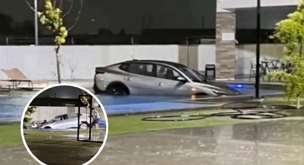 Al llegar a esa zona, el auto fue perdiendo contacto con el suelo y finalmente cayó al interior de la piscina. El automovilista logró salir del vehículo y ponerse a salvo, mientras cámaras de seguridad captaron cada momento del incidente, que fue difundido rápidamente en redes sociales y medios locales.