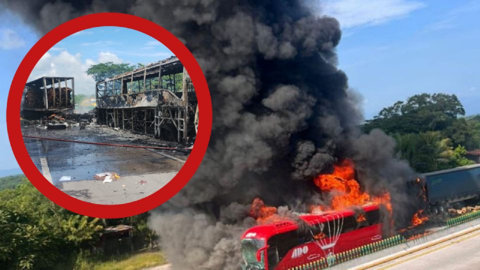 Después del encontronazo, el autobús de pasajeros empezó a incendiarse, de la misma manera que la otra unidad de carga involucrada que quedó detrás del ADO.
