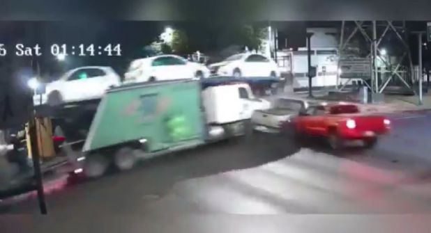 El camión nodriza, que se veía lleno de automóviles compactos, se pasó la señalización de alto. Una camioneta gris transitaba a velocidad considerable, pero estaba bajo la norma, pues el semáforo marcaba verde.
