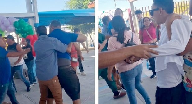 Sin embargo, en pleno desarrollo del programa, varios adultos comenzaron a empujarse y forcejear frente a los asistentes. Videos difundidos en redes sociales muestran el momento en que los padres se jalonean bajo un arco decorado con globos, mientras otros intentan intervenir para detener la pelea.