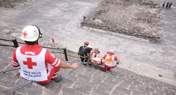 La turista canadiense que perdió la vida durante un tiroteo en Teotihuacán fue captada en video cuando era descendida en una camilla por las escalinatas de la pirámide de la luna.
