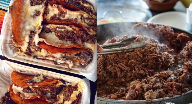 Las quesabirrias, la perfecta combinación de queso, salsa y birria se encuentran juntas en este antojito, una especie de taco de birria bañado en salsa de chiles y especias y va atiborrado de queso.