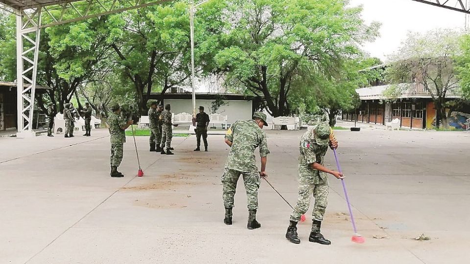 La labor social por parte de la Secretaría de la Defensa Nacional llegó la mañana de este jueves a la Escuela Normal Cuauhtémoc, donde se realizaron únicamente acciones de limpieza de patios y jardineras, así como el retiro de maleza en los alrededores.
