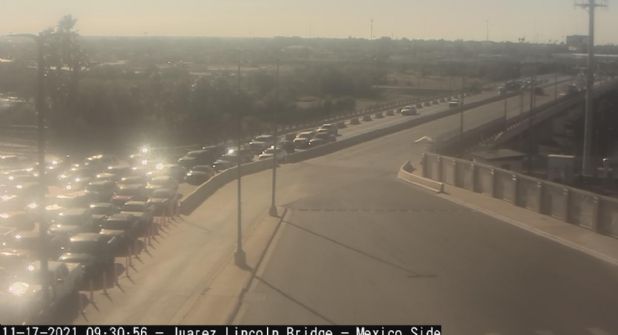 En el Puente Internacional II, Juárez-Lincoln se presenta una condición similar, ya que hay un cuarto de puente lleno, pero los vehículos siguen llegando a las inmediaciones en el lado mexicano.