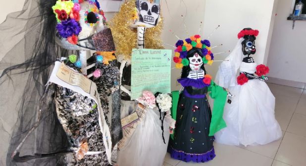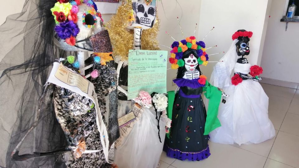 Son más de 15 figuras entre catrinas y catrines, todas elaboradas con papel periódico de El Mañana y La Tarde, combinados con otros materiales reciclables entre los que destacan las bolsas de plástico, popotes, brillos, flores entre otros.