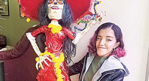 “La catrina de nombre Ariché significa atardecer en Tarahumara, está hecha de cajas de cartón, engrudo utilizando de relleno y moldeando con el periódico EL MAÑANA; me tardé dos semanas, la figura la saqué, calqué en cartulina en grande y fui a comprar las cosas que me faltaron”, explicó la joven.