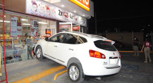 Según las primeras versiones el hombre llegó a la tienda y se estacionó en uno de los cajones, pero el lugar de meter freno, aceleró de más, brincando los tubos de contención e impactarse contra las ventanas de cristal.