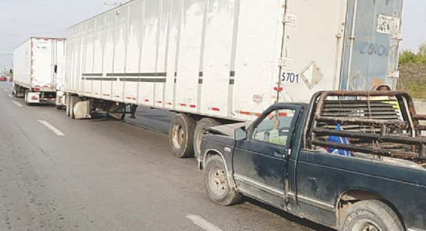 Dos tráileres y una camioneta se vieron involucrados en un choque por alcance registrado ayer en la mañana sobre la Carretera Aeropuerto y la intersección con la Carretera Nacional. Los datos recabados en el lugar del accidente fueron en el sentido de que un trailero frenó bruscamente y el otro chocó contra su caja, mientras que el tercer conductor de una vieja camioneta Ford se estrelló contra la parte trasera del enorme contenedor.