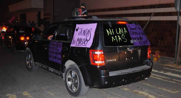 Varios cientos de autos, conducidos por mujeres y feministas, de manera espontánea acudieron al Monumento a Benito Juárez en la Calle Reforma de la ciudad de Nuevo Laredo y armaron un "gallo" en conmemoración del Día Internacional de la Mujer.