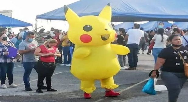 Las largas filas bajo el intenso calor característico de Nuevo Laredo, no fueron impedimento para que "Pikachu" acudiera puntual a su cita para aplicarse la vacuna contra el covid-19.