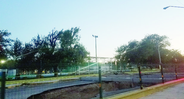 En calle Pino Suárez entre las avenidas Gómez Farías y Emiliano Zapata la calle se empieza a ceder bajo presión aunado a la humedad reblandeciendo el terreno, agravándose el problema con las recientes lluvias.