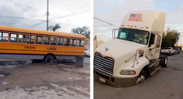 Por otro lado, un tráiler quedó atrapado por otro socavón en la colonia Las Torres en el crucero de las Avenidas Guanajuato y Caudillos del Sur.