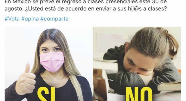 En un ejercicio realizado por El Mañana en el que participaron 10 mil 100 usuarios de las redes sociales, se cuestionó si estaban de acuerdo o no con enviar a sus hijos a clases el 30 de agosto, el 59 % dijo que No, mientras que el 41 % votó a favor.