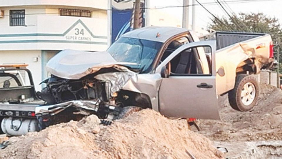 La camioneta pegó contra una pequeña máquina y brincó la montaña de tierra para caer entre las vigas del socavón y quedar atorada.
