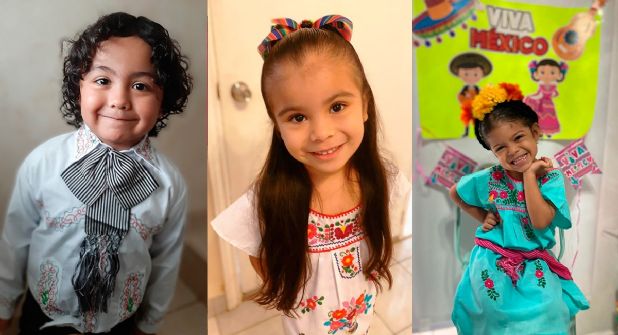 Los niños con bigotes, sombreros y hasta de charros o con sus camisas de manta, como en la época de 1810, mientras que las niñas de cabello trenzado, faldas circulares llenas de flores, se presentaron ante sus profesores en la clase en línea, algunos como el jardín de niños General Manuel Mier y Terán, hicieron honores a la bandera.