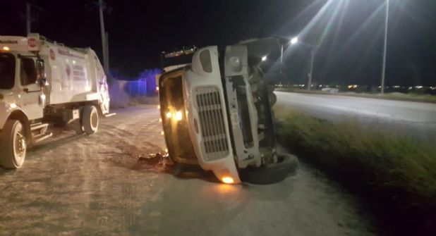 Por su falta de precaución al volante, el operador de un camión recolector de basura volcó en la Carretera a Piedras Negras, resultando ileso de puro milagro.