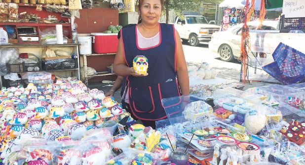 Cuando se acerca esta fecha aquí estamos vendiendo las calaveritas, pero también tenemos el papel picado y otros dulces mexicanos, ya desde hace dos semanas estamos vendiendo y la gente ya viene a comprar las calaveritas para los altares”.