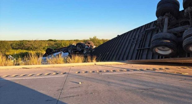 Un tráiler se volcó y quedó a un lado de la carretera Monterrey-Nuevo Laredo cerca de la antigua garita conocida como el Kilómetro 26 de la autopista que conecta Nuevo León con la ciudad fronteriza.
