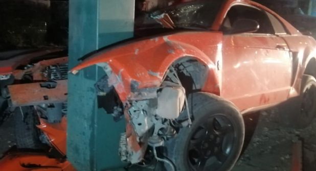 Abrazado de un poste de bandera quedo un carro Mustang cuyo propietario se estrelló gachamente con él y como pudo, logró salir del automóvil y darse a la fuga, pero dejo estrellado el vidrio delantero que pego con su cabeza y posiblemente haya salido herido. El accidente se reportó a las 10.00 de la noche del lunes sobre la Carretera Aeropuerto frente a la colonia Nueva Era.