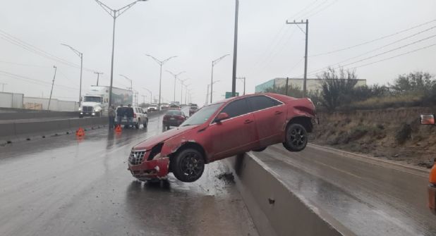 Espectacular accidente se registró sobre el puente de la Carretera Aeropuerto Luego de que el chofer de un auto Chrysler se incorpora sin precaución a los carriles de alta velocidad y de paso choca contra el costado delantero de un Jeep Patriot, quedando el carro del responsable trepado sobre el muro de contención del puente mencionado.
