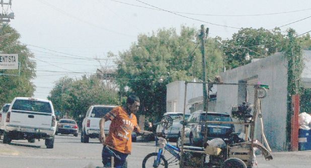 Soportando temperaturas superiores a los 40 °C, un hombre con capacidades diferentes empuja su triciclo adaptado mientras recolecta lo que puede a su paso por la colonia Hidalgo. A falta de piernas, avanza sobre sus dos rodillas, que lleva vendadas y protegidas con dos almohadillas para amortiguar su propio peso.