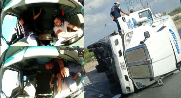 El metraje capta como mientras el trailer avanza a una velocidad de 25 millas por hora, pierde la estabilidad al avanzar por una pequeña curva y provocado por la inercia de la carga, se vuelca a la orilla de dicha vialidad.