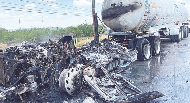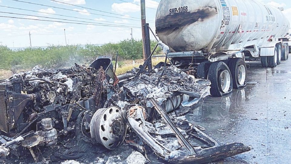 Un tráiler que transportaba doble remolque de pipas con diésel se consumió en su totalidad, al incendiarse al parecer por un cortocircuito, en el Libramiento Mex II de Nuevo Laredo.