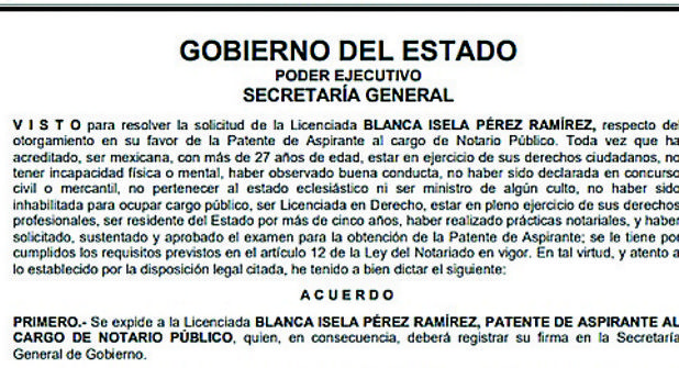 El documento de dominio público confirma que este fíat es acordado y firmado por Francisco García Cabeza de Vaca en calidad de gobernador de Tamaulipas y por Gerardo Peña Flores, como secretario general de Gobierno, otorgando la patente desde el 14 de junio del presente año, siendo publicado el miércoles en el POE.
