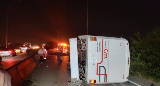Tras chocar contra el muro de concreto del puente Transformación, el vehículo pesado volcó sobre su costado derecho, y sólo 15 de los ocupantes resultaron con golpes.
