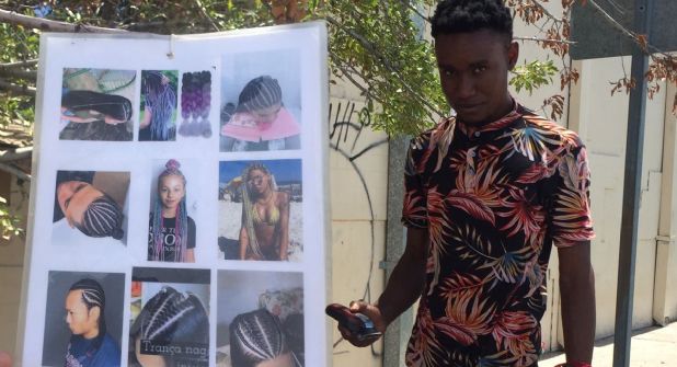 Con una carpa improvisada sobre una banqueta, con la ayuda de una capa y sus herramientas personales de trabajo, un grupo de hombres haitianos se ha puesto manos a la obra ofreciendo sus servicios de estilismo, barbería y hasta peinado de trencitas africanas.