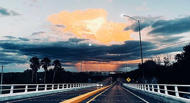 La lluvia, los rayos de sol provocaron que las nubes se tornaran en color rojo "fuego" en el cielo de los Dos Laredos. De paso, las tormentas solo se hicieron presentes en algunas colonias de Laredo, Texas.