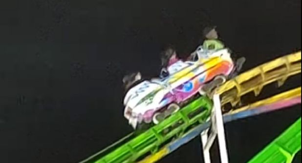 Un usuario de Facebook Identificado como Markitos Perez compartió un video donde se ve el momento en el que, con ayuda de una grúa, un sujeto sube a la estructura de la montaña rusa para arreglar la falla.