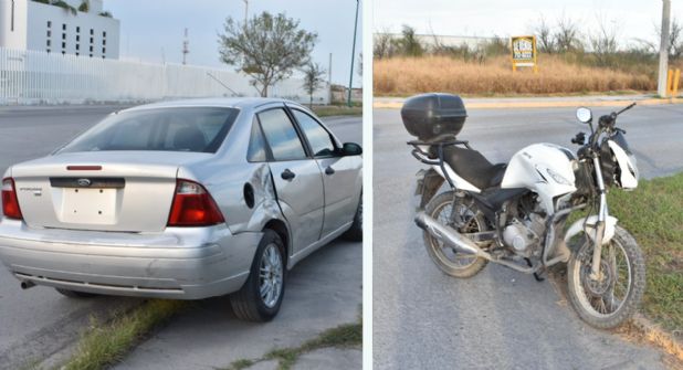 Una moto propiedad del Banco Azteca tuvo un fuerte encontronazo con el costado trasero de un vehículo Focus en el Bulevar Municipio Libre.