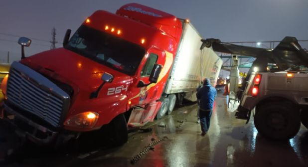 De acuerdo con las autoridades, el exceso de velocidad, el pavimento resbaladizo y la falta de precaución del conductor, provocaron que el trailero chocara contra el muro de contención. De milagro estaba vivo el operador del enorme vehículo, quien presuntamente decidió dormir la mona dentro del camarote del vehículo que tripulaba, mientras personal de una empresa de grúas realizaron maniobras para remover el tráiler que estuvo a punto de volcarse.