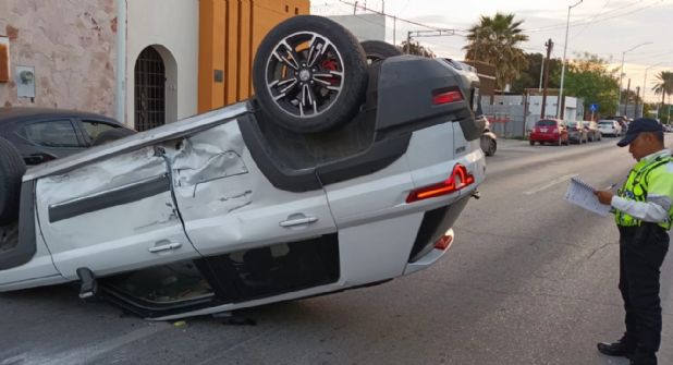 Una madre de familia no llegó al Seguro Social ni un joven a su escuela ya que ambos participaron en un aparatoso choque con volcadura de uno de los vehículos en el crucero de Venezuela y Aquiles Serdán esta mañana.