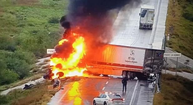 Con el pavimento mojado y a exceso de velocidad, un tráiler que circulaba en la autopista Monterrey-Nuevo Laredo, en el tramo La Gloria-San Fernando, chocó contra las barreras de contención al perder el control del vehículo su conductor. Tras el impacto, el tráiler comenzó a incendiarse, provocando el cierre de la carretera durante horas.