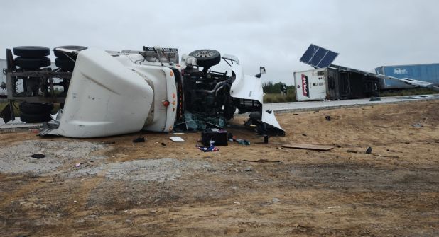 Un hombre murió y otro resultó ileso al volcar el tráiler en que viajaban en la autopista de la carretera a Nuevo Laredo, este viernes por la mañana.