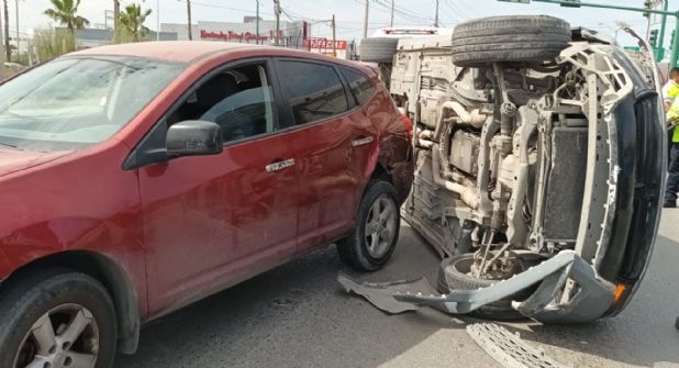 Un joven y un niño resultaron lastimados en un choque-volcadura registrado el mediodía de hoy sobre la Calzada de Los Héroes y la avenida Manuel Ávila Camacho, muy cerca del edificio de Seguridad Ciudadana.