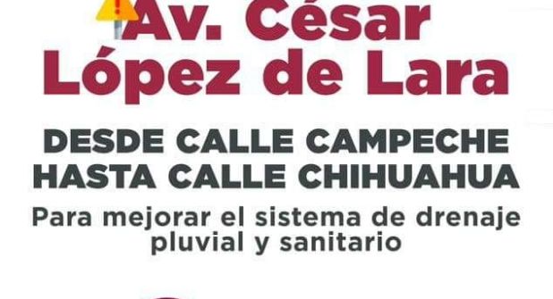 Para reemplazar más de 380 metros lineales de drenaje, desde hoy y por un lapso aproximado de 60 días será cerrada la Avenida César López de Lara, entre Chihuahua y Campeche, hasta concluir la rehabilitación del drenaje pluvial y sanitario del sector, de parte de la Comisión Municipal de Agua Potable y Alcantarillado.
