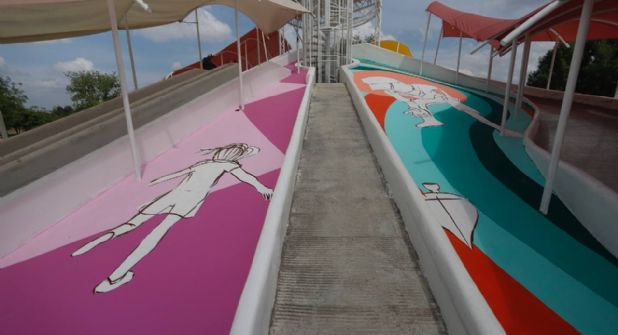 Las imágenes realizadas en los resbaladeros son juegos o juguetes tradicionales que eran utilizados en otras generaciones, precisamente para que las nuevas conozcan lo que otras usaban para divertirse.