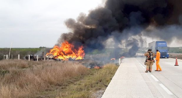 Personal de Protección Civil y Bomberos de Nuevo Laredo acudió hasta el lugar para combatir las enormes llamaradas que consumieron totalmente la unidad de carga y además dejaron una intensa humareda que se podía apreciar a kilómetros.