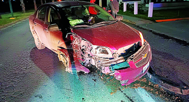 Al no poder enderezar el rumbo, terminó proyectándose contra un poste de la CFE que no sufrió daño alguno, pero su vehículo sí, pues quedó con el frente destruido.