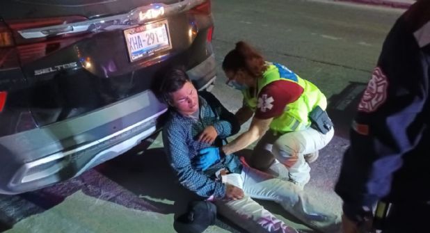 Oficiales de la Dirección de Tránsito y Vialidad fueron enviados al lugar del accidente y al llegar, se encontraron con el hombre recargado en la defensa de un auto y quejándose de golpes en el cuerpo.