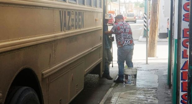 De acuerdo a las imágenes, el conductor, de quien se desconoce el nombre, detuvo su unidad y después bajó una cubeta blanca que deposita momentáneamente en el suelo.