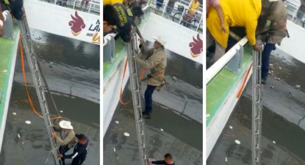 En un video, cortesía de Protección Civil, se observa a un hombre, identificado como Juan Jaramillo, quien es apoyado para salir de la zona inundada, luego de quedarse varado en su camioneta Ram modelo 94.