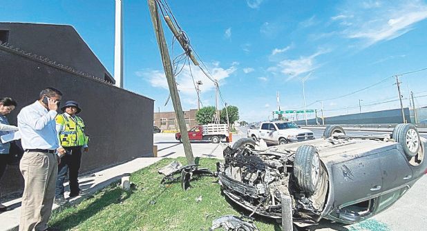 Tras ser impactada por un tractocamión, una mujer volcó de manera aparatosa al chocar contra un poste de madera en la Carretera Aeropuerto, resultando con golpes menores.