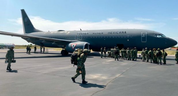 Los soldados de refuerzo arribaron a la zona a través del Aeropuerto Internacional Quetzalcóatl, ubicado en el surponiente de NUevo Laredo, Tamaulipas.