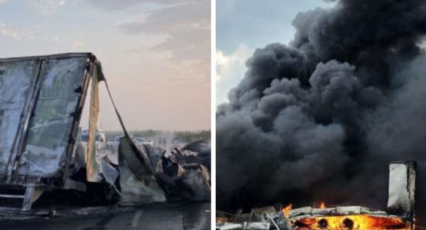 El primer accidente fue doloroso, pues dejó a dos personas calcinadas en el kilómetro 167 en la vía libre de la carretera Monterrey-Laredo. Eran las 5:30 de la madrugada cuando se reportó un choque de frente luego de que uno de los dos tráileres intentó rebasar.