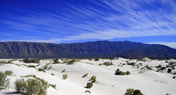 La arena de este cúmulo de dunas, ubicadas en Cuatro Ciénegas, es tan clara que llega a confundirse con la nieve a simple vista; se trata de silicio y calcio que quedó en la zona donde hace millones de años se formaba un océano, según los científicos.