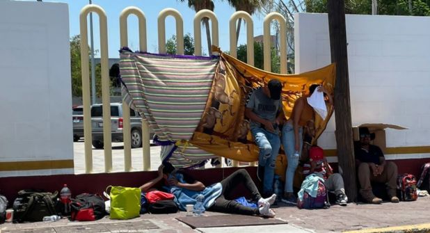 Bajo el sol y a pesar de las altas temperaturas, cientos de migrantes, incluso familias enteras, la gran mayoría procedentes de Venezuela, Colombia y algunos de El Salvador, permanecen en las aceras cercanas al puente internacional número uno, improvisando techumbres con cartones, toallas y sábanas, durmieron a la intemperie.